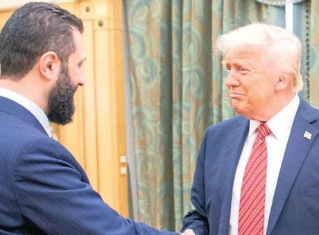 * Trump 14 Mayıs günü Riyad’da Suudi Arabistan Veliaht Prensi Muhammed bin Selman eşliğinde Şara ile görüşmüş, Cumhurbaşkanı Erdoğan da toplantıya telekonferans yoluyla katılmıştı. Trump, bir gün önce Suriye’ye yaptırımları kaldırdığını açıklamış, bu süreçte Cumhurbaşkanı Erdoğan ve Suudi Veliaht Prens Selman ile yaptığı görüşmelerin etkili olduğunu söylemişti.