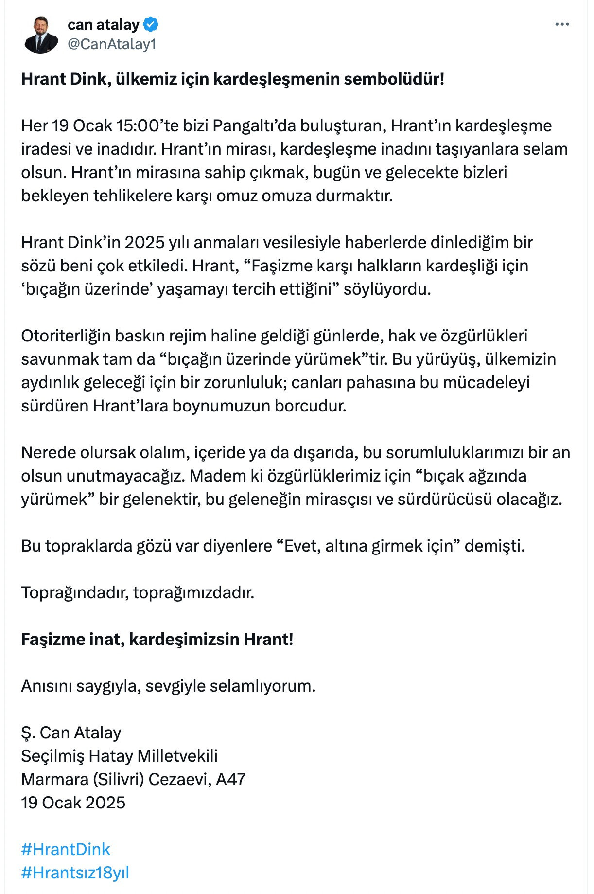 DUVAR – TİP’ten Hatay milletvekili seçilen Gezi tutuklusu Can Atalay, Agos Gazetesi Genel Yayın Yönetmeni Hrant Dink’in katledilişinin 18’inci yıl dönümünde anma mesajı yayınladı.